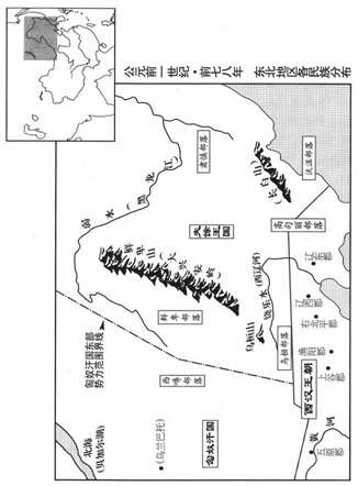 2匈奴汗国(王庭设蒙古国哈尔和林市)袭击五原郡(内蒙古包头市)、酒泉郡(甘肃省酒泉市),斩两民兵司令(都尉)。