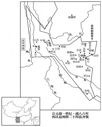 刘彻又命唐蒙、司马相如,诱导西南夷各部落归附。接着派遣皇家警卫官(中郎)郭昌、卫平等人,在西南夷故地设置牂柯郡(贵州省福泉县),在邛都(四川省西昌市)设置越巂郡,在筰都(四川省汉源县)设置沈黎郡,在冉駹设置汶山郡(四川省茂县),在白马(甘肃省西和县西南蒿林乡)设置武都郡。于是夜郎国(贵州省关岭县)、滇国(云南省晋宁县东晋城镇)的国王,先后到首都长安朝拜,因而在滇国设置益州郡。这是西南疆土的开拓。