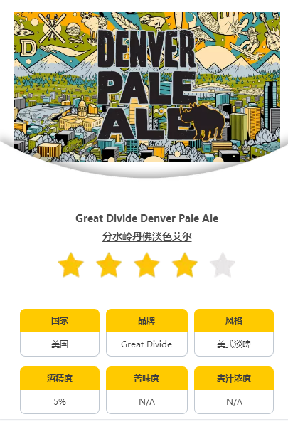 在距离 Colorado Rockie 球场不到两公里的地方有一家名为 Great Divide 酒吧,这里出售的 Denver Pale Ale 是整个城市最受欢迎的精酿啤酒。