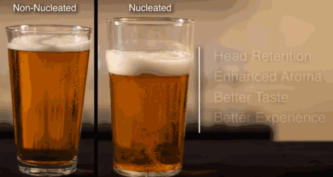 在实验中,研究人员用了两种酒杯,一种酒杯用蚁酸清洗过,确保杯壁上无纤维附着,避免气泡成核,另一种杯子是没有用蚁酸清洗过的酒杯。将啤酒倒入用蚁酸清洗过的酒杯,酒内无气泡,非常平静。但是,在未被蚁酸清洗过的酒杯中,酒内有气泡产生,并形成多个气泡串。所以,水至清则无鱼,杯至净则无泡,喝酒的杯子要干净,但不可绝对干净。