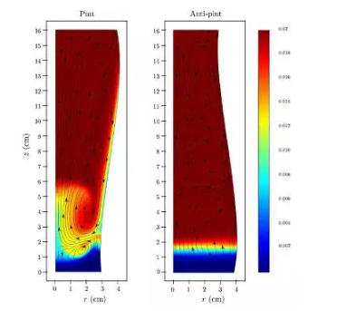 为了印证这种猜测,他们又模拟了倒扣的啤酒杯,并发现这种环流非常的弱,甚至形成了反环流。气泡在这种情况下就不一定还那么执着的下沉了。