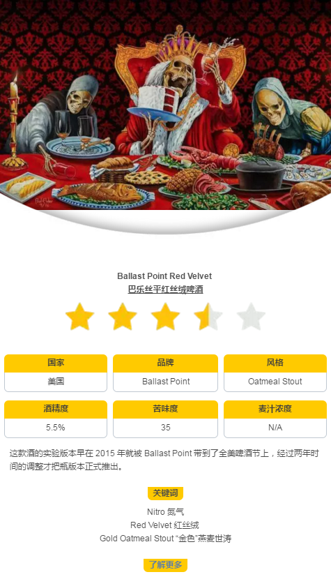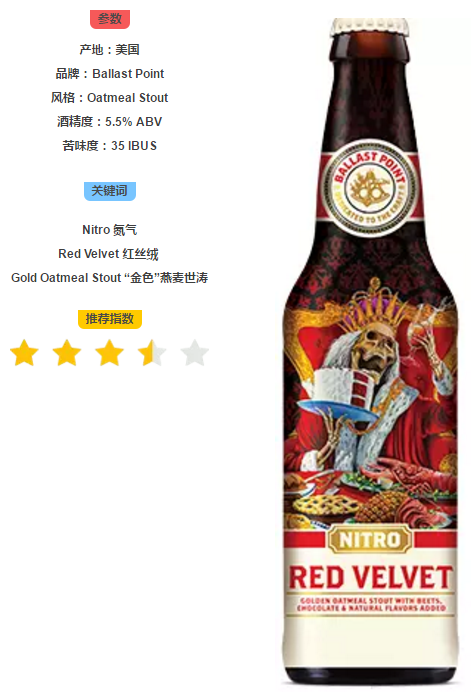 口感:氮气带来了丝般的顺滑,顶层绵密的泡沫,配合上红色靓丽的酒体尝下去确实很容易脑补出,红丝绒蛋糕的感觉。