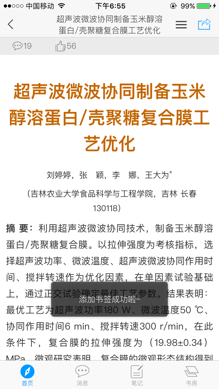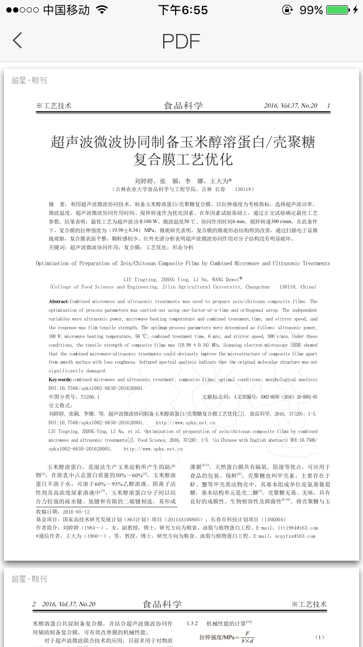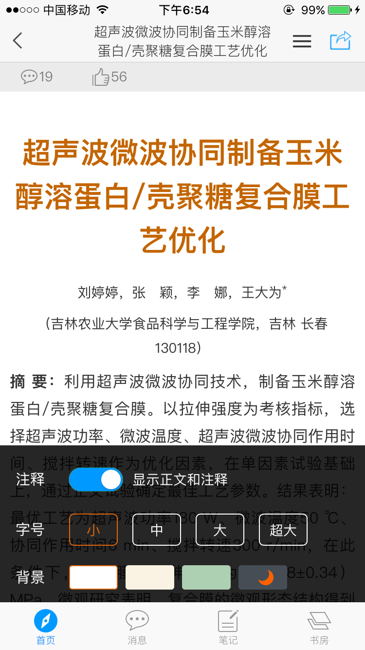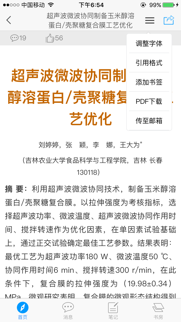 在期刊单篇文章页面,支持点赞、评论、转发。右上角“三横”下有调整字体、引用格式、PDF下载、传至邮箱。