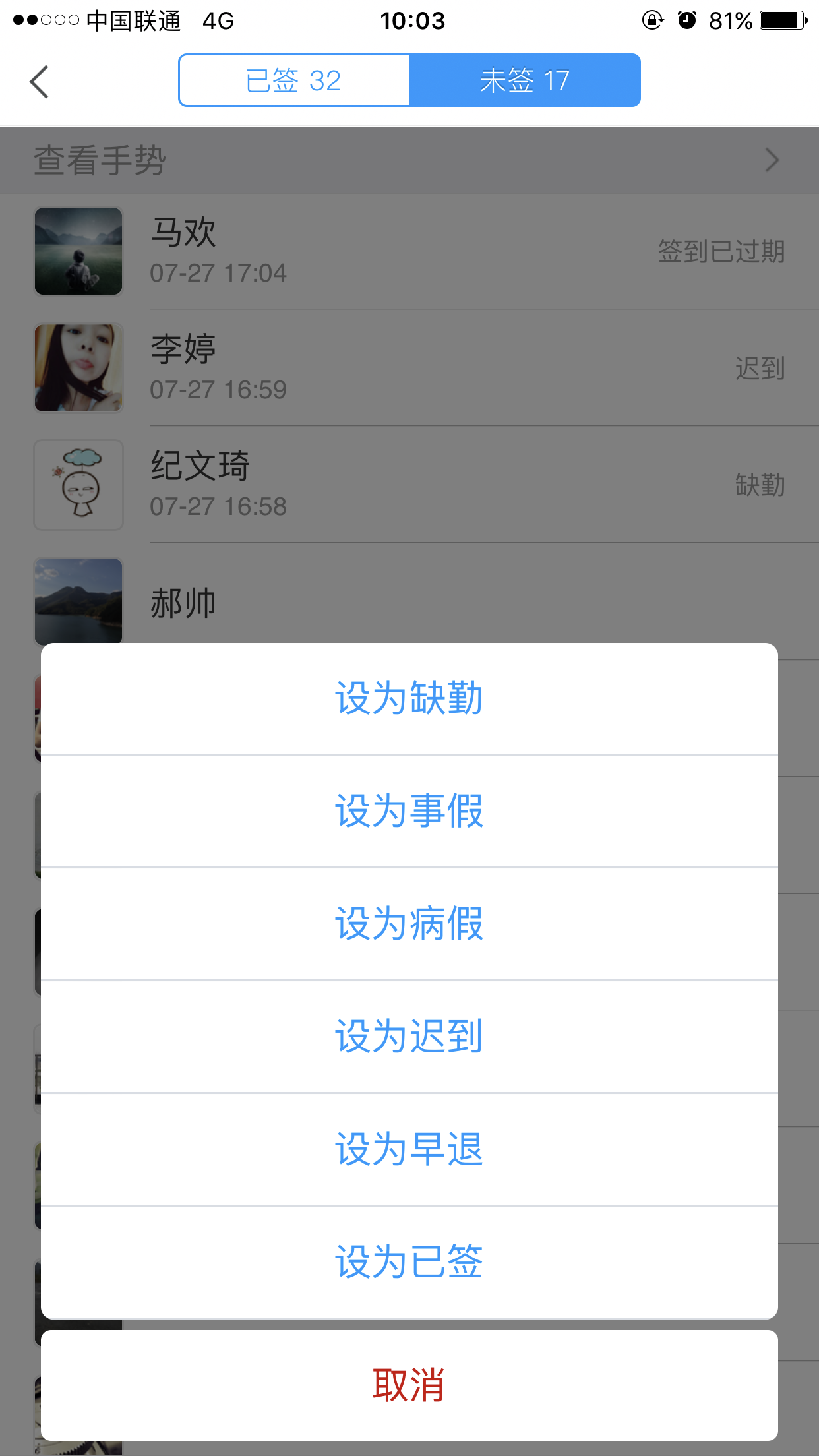 注:教师可根据签到情况将学生设置为缺勤,事假等。