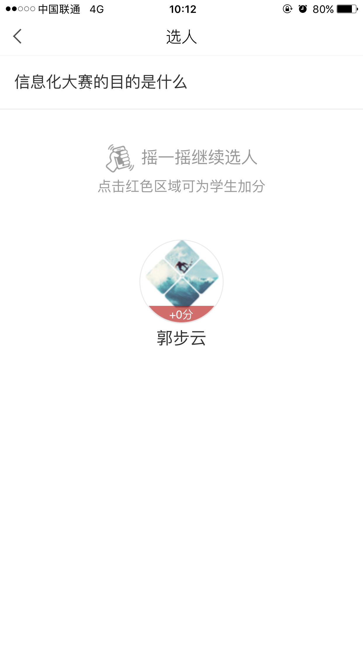 教师发布随机选人,移动课堂互动系统会自动在已经签到的学生中随机选择学生,并可以通过摇一摇继续选人: