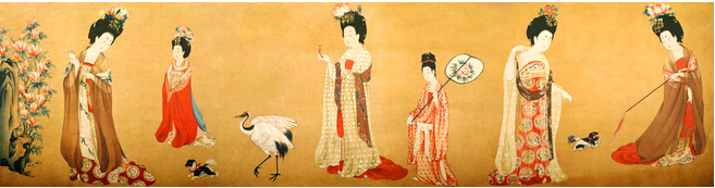 汉族传统服饰包括上下连属的深衣体系和上下分开的襦裙服体系,唐代妇女的服饰继承隋制,多上穿襦服下着长裙身加披帛。襦服是一种衣长不过膝盖的短衣,初唐时妇女流行穿小袖、窄袖襦衣。中唐以后女性体态丰腴、以胖为美,女装开始流行衣衫拉长、袖口宽大的样式,并且女装衣领阔而低,发展为推袒胸式服装。唐代贵族妇女们跳出封建礼教的约束而坦然面对自己的身体,表现出对人体美的大胆追求,古诗中“慢束罗裙半露胸”、“半胸酥嫩白云绕”等题咏,就是唐代诗人们对此毫无保留的赞美,也反映了当时的时尚风气和审美标准。《簪花仕女图》中的仕女们穿着可透视的纱衣蔽体,袒胸露半乳,衣衫轻薄透明,肌肤若隐若现,彰显出慵懒、华贵、?愿兄馈?