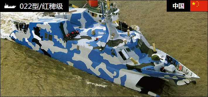 022型导弹艇(北约代号:“红稗级”,英文:Houbei class)是2004年4月上海江南造船厂所建造的新一代中国人民解放军海军导弹快艇。因其首艘编号为2208,故此得名。022级快艇是全世界第一种采用高速穿浪式艇设计的导弹快艇,因此在发现之初曾引起“是否为试验艇”的疑问;但随着各地造船厂的大量建造下水,至2009年中已经有超过80艘下水或服役,已经证明它不是试验艇。 由于是双体船形,赋予了它较好的稳定性,利于在海上风浪中行进。
