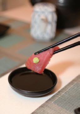 芥末取少许放在生鱼片上再蘸酱油。 |