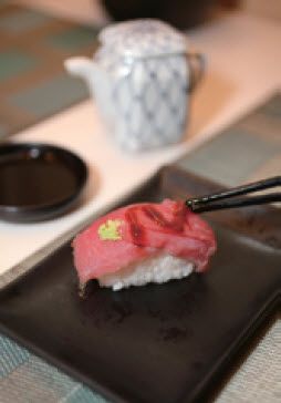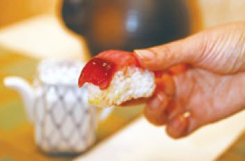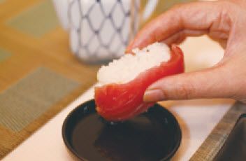 更高端的手法是:用手拿起寿司,迅速倒转过来,把鱼肉那一面轻轻蘸取些许酱油,再整粒送入口中。