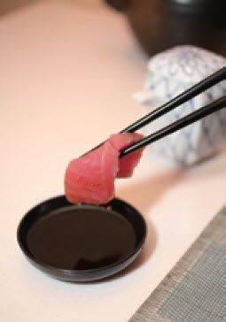 | 将寿司反转,以鱼肉面蘸酱油。 |