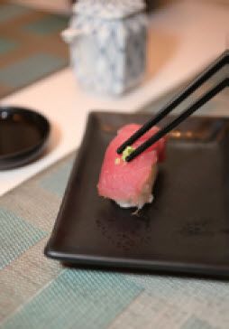 用这个方法要小心在倒转寿司时,鱼肉很容易会掉落下来引起尴尬,所以事先练习一下较好。