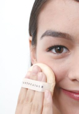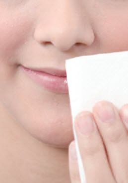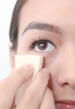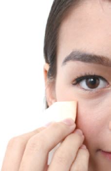 | 3.用面纸轻轻按压全脸,把多余水分吸掉。 | 4.以海绵蘸上粉饼粉,轻轻在眼底、T字部位等易脱妆的部位按压,以补回已掉的粉。 |