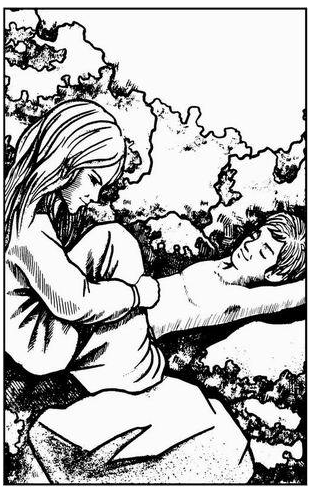 两个小小的人体正朝着岩石游来,女孩已经昏过去,躺在男孩子的臂上。彼得使出了最后一点力气,把温迪拽上岩石;然后,在她身边躺倒了。虽然他自己也昏迷了,他却知道湖水正在上涨。他知道他们很快就要淹死,可是他实在无能为力了。