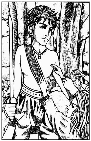 说着,他拔出了刀;这一刻,他表现出不可一世的高昂气势。别的孩子不安地退了下去。这时彼得回来了,他们立刻就看出来,从他那儿是得不到支持的。他不肯违背一个女孩的意愿强留她在永无乡。