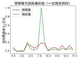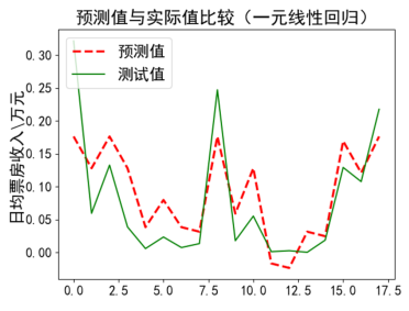 | plt.title(u'预测值与实际值比较(一元线性回归)') # 画出预测值折线 # 显示测试值折线 |