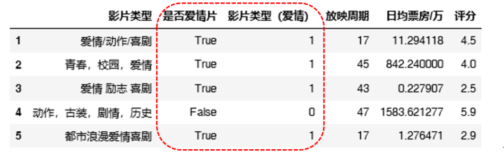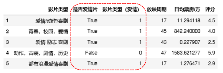 | from sklearnimport preprocessing # 对电影类别进行数值化处理 le = preprocessing.LabelEncoder() new_df['影片类型(爱情)'] = le.fit_transform(new_df['是否爱情片']) |