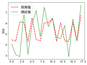 # 拆分训练集和测试集 x_train, x_test,y_train, y_test=train_test_split(df[['影片类型(爱情)','放映周期','日均票房/万']],df[['评分']],train_size=0.8, test_size=0.2) # 建立线性回归模型 regr = linear_model.LinearRegression() # 数据拟合 regr.fit(x_train, y_train) # 系数、截距 print('系数:',regr.coef_) print('截距:',regr.intercept_) # 给出待re预测的一个特征 y_pred = regr.predict(x_test) plt.plot(range(len(y_pred)),y_pred,'red', linewidth=2.5,label=u"预测值",linestyle='--') plt.plot(range(len(y_test)),y_test,'green',label=u"测试值") plt.legend(loc=2) plt.ylabel('评分') # 显示预测值与测试值曲线 plt.show() |