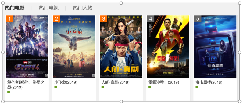 | <dl id="topMovieSlide"> <dd id="top_218090" movieid="218090" year="2019" month="4" day="24" pan="Dis-HotMovie1"> <em>1</em> <p> <a href="http://movie.***.com/218090/" target="_blank" title="复仇者联盟4:终局之战/Avengers: Endgame(2019)"> <img src="http://img5. .***..cn/mt/2019/03/29/095608.66203322_175X262X4.jpg" width="175" alt="复仇者联盟4:终局之战/Avengers: Endgame(2019)" /></a></p> <h3><a href="http://movie. .***..com/218090/" target="_blank"title="复仇者联盟4:终局之战/Avengers: Endgame(2019)">复仇者联盟4:终局之战(2019)</a></h3> <p><span></span> <span class="c_green px14"></span> </p> </dd> |