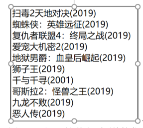 从爬取的内容中,可以找到热门电影部分。找到某一部热门电影对应的网页数据源码结构部分。示例如下,显示的是热门电影名为“复仇者联盟4:终局之战(2019)”的源码,加粗加框且灰色背景部分的文字即是计划需要抽取的目标内容。
