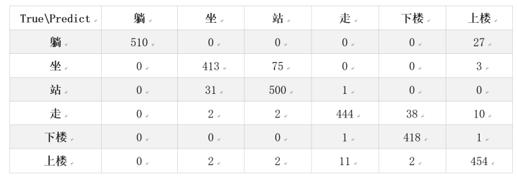 | predicts = model.predict(X_test) ACTIVITIES = {0: '走',1: '上楼',2: '下楼',3: '坐',4: '站',5: '躺'} def confusion_matrix(Y_true, Y_pred): Y_true = pd.Series([ACTIVITIES[y] for y in np.argmax(Y_true, axis=1)]) Y_pred = pd.Series([ACTIVITIES[y] for y in np.argmax(Y_pred, axis=1)]) return pd.crosstab(Y_true, Y_pred, rownames=['True'], colnames=['Pred']) print(confusion_matrix(Y_test,predicts)) |