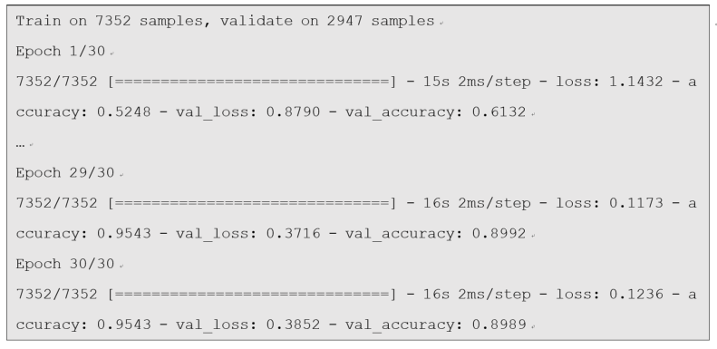 | epochs = 30 # 训练次数 batch_size = 16 # 每个批次大小 n_hidden = 16 # 隐层单元个数 n_classes = 6 # 类别个数 timesteps = len(X_train[0]) input_dim = len(X_train[0][0]) |