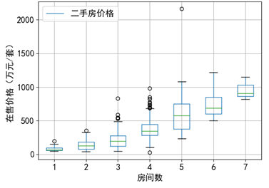 使用箱形图展现温州市区不同房间数的房价分布情况。示例结果如图所示。