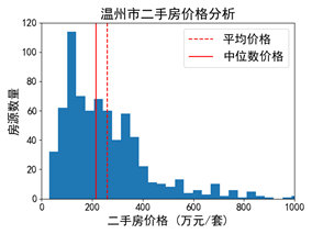 使用直方图展现温州地区的二手房价格统计结果,横坐标为房价,纵坐标为二手房房源的数量。示例参考如图所示。