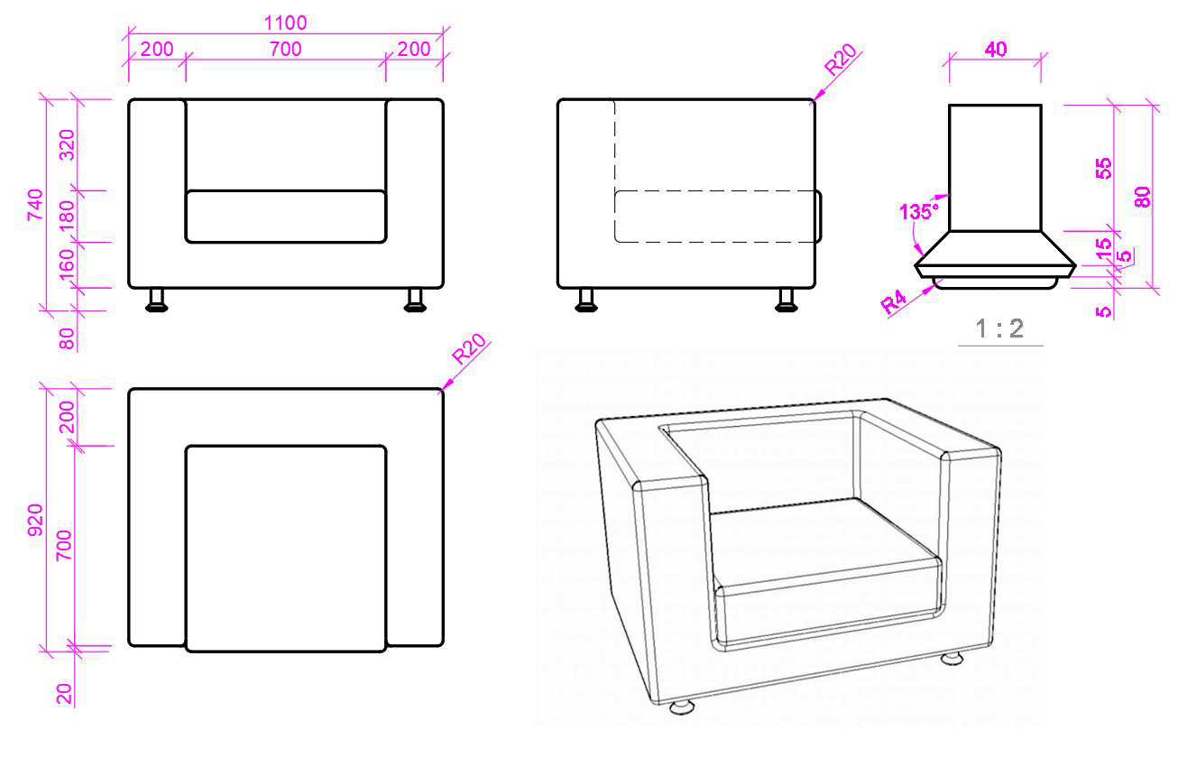请参照下图绘制沙发设计图。临摹绘制沙发与柱脚的视图并标注尺寸;按设计图中相关尺寸要求,创建该沙发的立体模型;A4图纸打印输出。