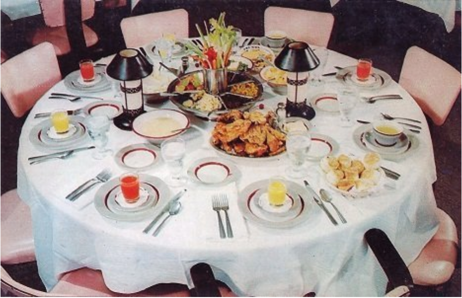 Chairs are to be out from the table away from the tablecloth, if 1 is used. The table is usually covered with a tablecloth.