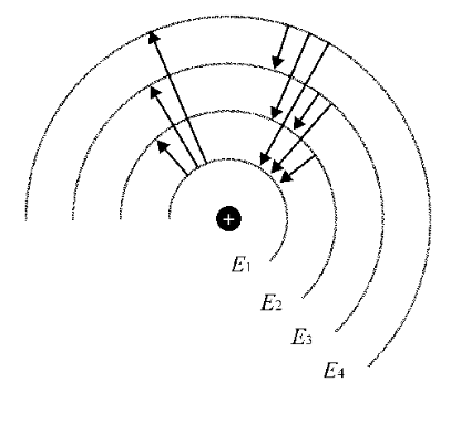 核外电子在一定的轨道上运动,在这些轨道上运动的电子不放出能量也不吸收能量,电子处于某种“定态”(stationarystate)。轨道上电子有特定的能量值,称为“能级”(energy level)。核外电子能量为