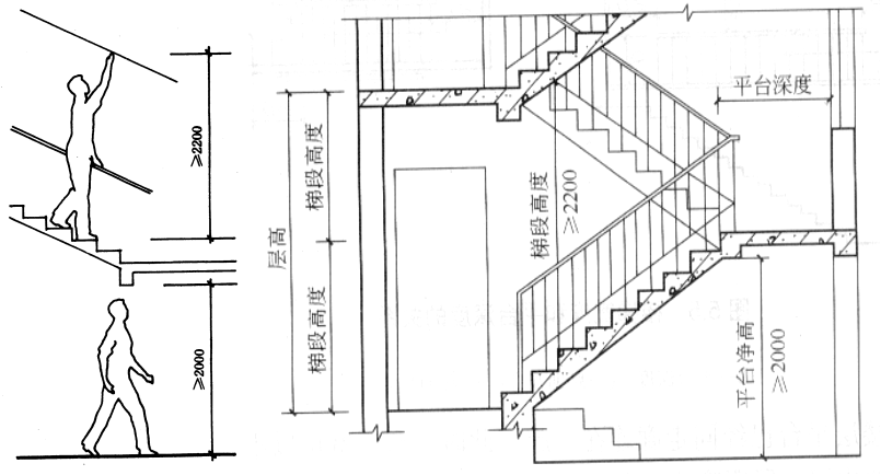 楼梯的净空高度包括楼梯段间的净空高度和平台过道处的净空高度。