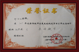 (11)2017年5月,指导成婷、王谷等学生获得成都市教育局、成都创业学院举办的成都市中职学生“创业计划书”设计大赛中获得一等奖,本人获“优秀指导教师”奖。