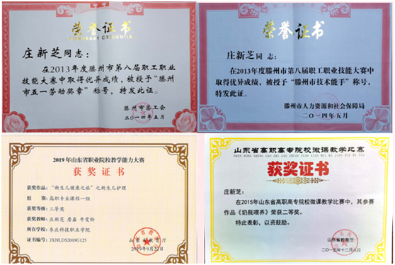 2019年参加山东省高校教师教学能力大赛获三等奖。多次被评为“学院优秀教师”、“自考本优秀教师””、“学院技术能手”;
