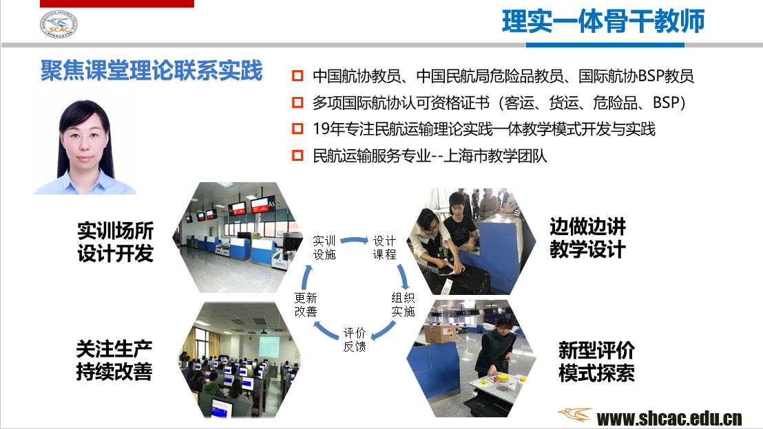 曾经荣获民航局科技成果奖三等奖,曾参与上海市航空公共服务实训中心建设和初期管理工作,参与开发离港系统实训课程和模拟候机楼实训项目,参与教育部职成教司中等职业学校航空服务教学标准的建设等个科研项目。现参与多项民航局课题,主持航空货邮品名申报目录及配套查询系统建设,参与民航专业骨干能力提升项目,参与危险品在线学习系统建设项目。现阶段重点研究方向离港业务、危险品运输。