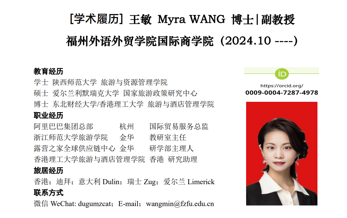 王敏(Prof.Min Myra Wang)管理学博士,师承宋海岩博导(旅游需求预测分析)+谢彦君博导(旅游现象学方向),MCSE微软网络系统工程师,福州外语外贸学院国际商学院副教授,爱尔兰国家旅游政策研究中心中方合作研究导师。ITSA国际旅游研究协会会员;CACSI中国青少年科创教育推广员;CCF中国计算机协会专业会员;阿里巴巴特聘创业导师;省数字文旅首席导师;体育+露营+研学主理人;省生态协会理事,及地方马术协会理事。