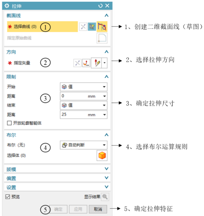 拉伸特征工具的一般操作步骤为:创建或选择二维截面线(草图)→指定拉伸方向(默认方向垂直于草图平面)→确定拉伸尺寸→选择布尔运算规则→预览并确定拉伸特征。注意:如果该特征是第一个特征或无其他相交特征,可以不用设置布尔运算。
