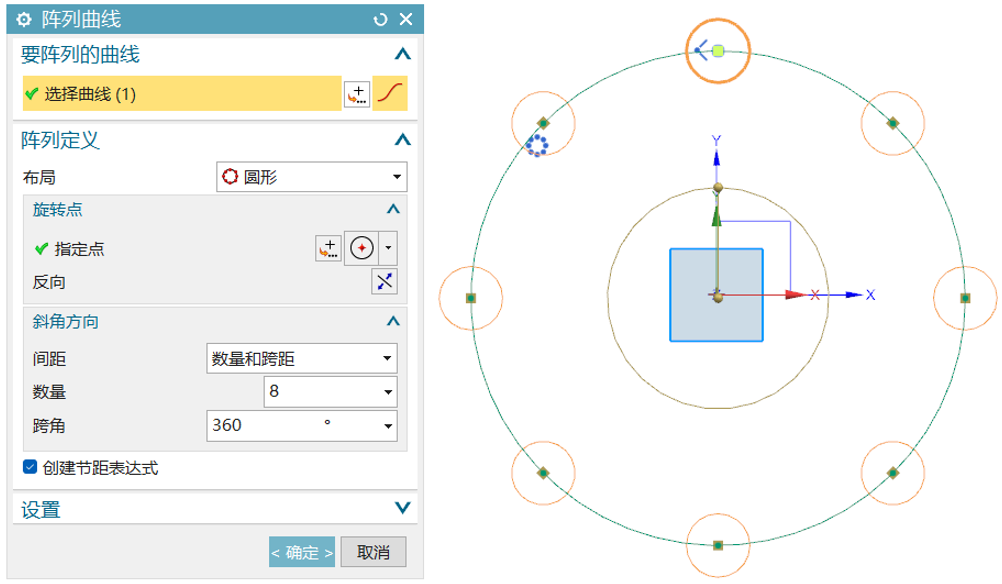 圆形阵列工具是创建绕一个中心点进行圆形布局的草图曲线复制工具,它的基本原理是选择要阵列的曲线以及旋转中心点,并设置间隔角度和数量来创建重复的多个曲线,如下图所示。