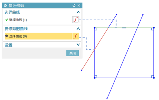 可以将曲线修剪到任一方向上最近的实际交点或虚拟交点。快速修剪窗口,默认修剪状态为根据选择对象自动判断修剪结果,也可以先设置修剪边界线,再选择修剪对象。