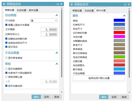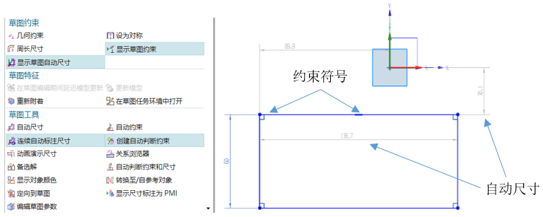 为了提升工作效率,三维软件的草图模块设置了一些默认功能,如显示约束:显示曲线对象的约束符号,自动标注尺寸:自动添加未标注的尺寸(注意颜色和已标注尺寸的区别)、自动判断约束:根据曲线自动添加常规的约束类型。这些内容均可通过草图首选项进行设置。