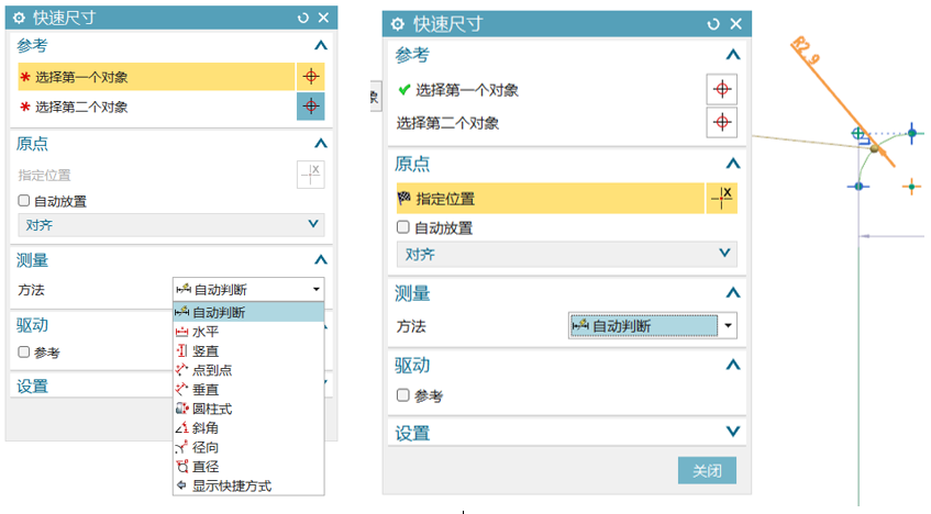 NX软件提供了智能化的尺寸标注工具,您可以在创建尺寸时明确地选择一种测量方法,也可以让 NX 自动判断测量方法。NX 根据您选择用作参考对象的对象以及放置尺寸文本原点的位置来自动判断测量方法。