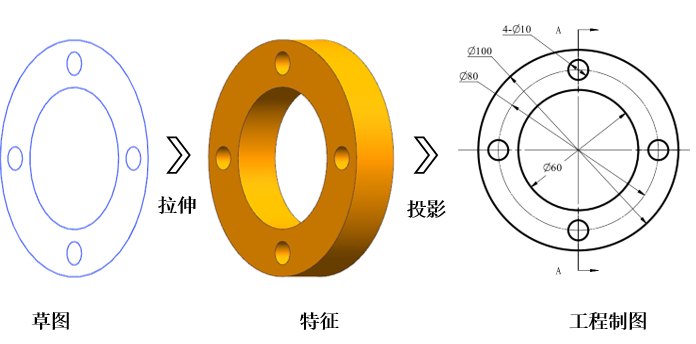 三维设计中的草图一般用于表达产品特征的初始设计概念或者精确的几何轮廓,任何三维特征都可以从草图开始进行表达,然后利用建模工具(拉伸、旋转、扫描等)生成所需的三维设计特征。