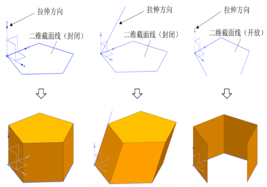 如果二维截面线是封闭的,那么自动拉伸为实体,如果二维截面线是开放的,那么自动拉伸为片体,如下图所示。