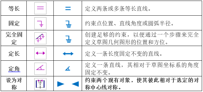 功能,软件会根据绘制曲线对象几何位置自动判断当前可用的约束类型自动添加约束类型,常用的约束命令工具及功能如表所示。