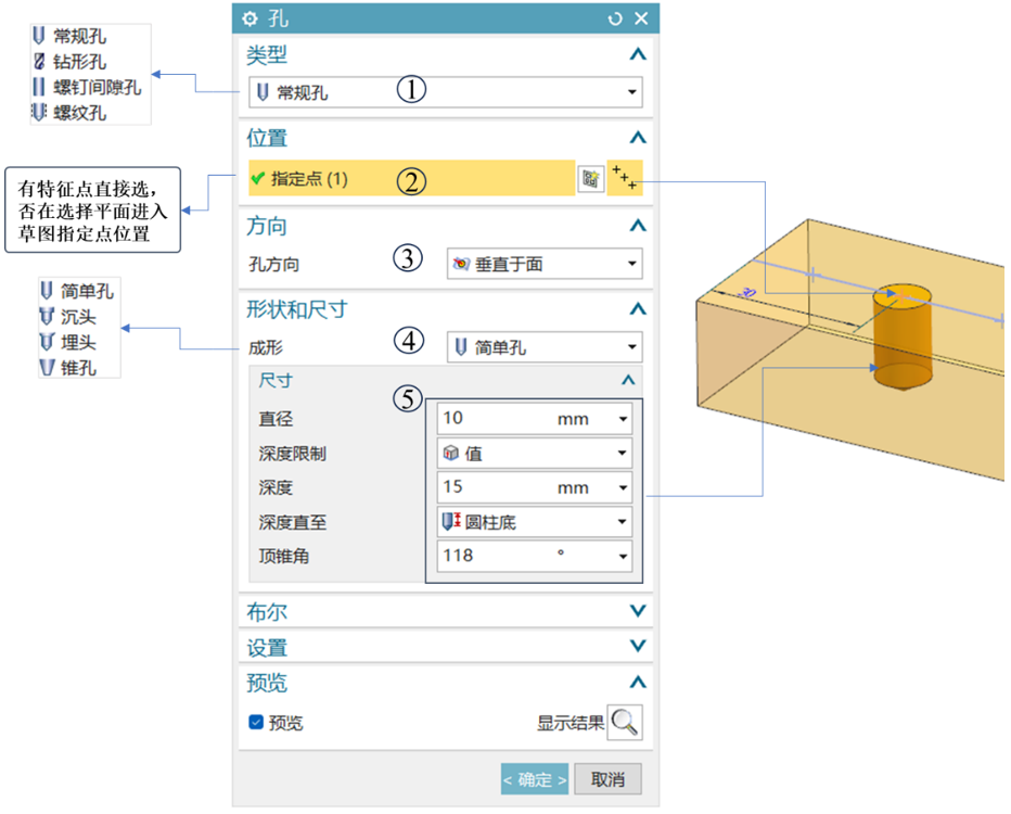 孔特征工具的一般操作步骤为:选择孔的类型➡指定孔顶面中心点位置➡确定孔的深度方向➡选择孔的形状类型➡设置孔的尺寸参数(不同孔形状尺寸不同:如简单孔需要输入直径、深度、顶锥角)➡预览并确定孔特征。