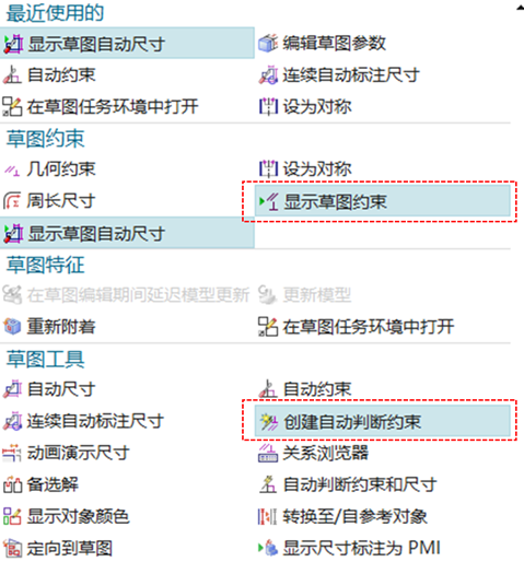 ,检查几何约束相关的命令已启用:其中显示草图约束及创建自动判断约束必须启用。