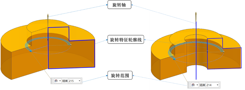 旋转截面轮廓线是特征在经过轴线的平面上投影轮廓的一半,而旋转轴可以是轮廓线上的直线,也可以是轮廓外的直线或者由点和矢量构成的轴。