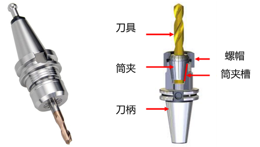 筒夹:筒夹是一种用于夹持数控刀具(如铣削或钻孔刀具)的筒形夹具部件,筒夹内部设有弹性夹紧机构,可以对刀具进行精确夹紧。这种夹紧方式使得铣刀在高速旋转时能够保持稳定,减小振动,提高加工精度。