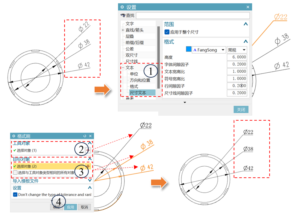 →进入设置窗口修改对应的内容(如文本方向改为水平线上,尺寸文本改为FangSong)→关闭设置窗口→单击格式刷