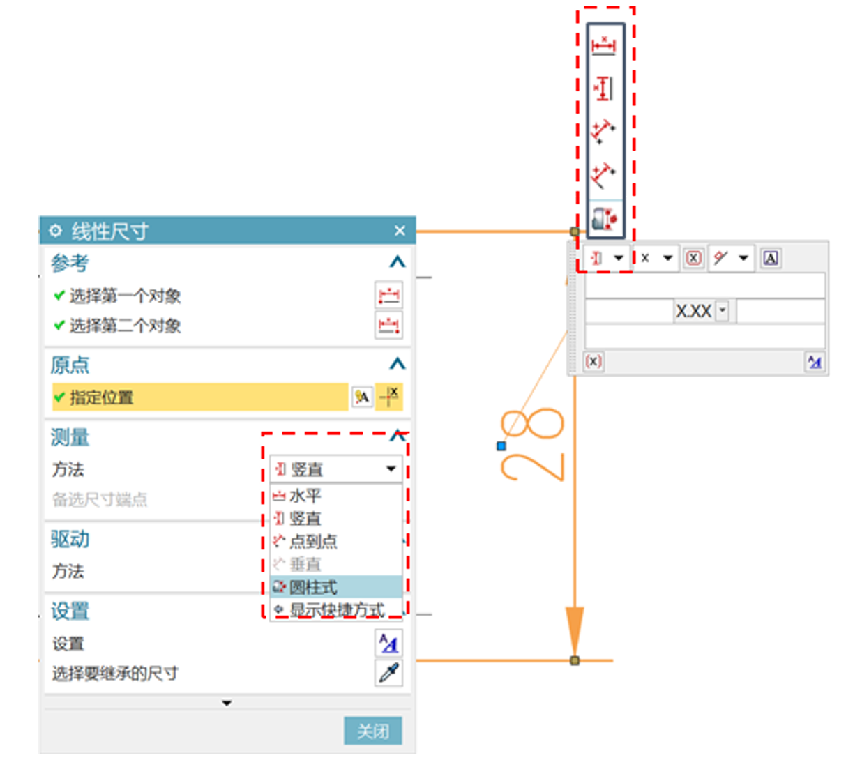 对于同种尺寸类型的不同测量方法的修改,初学者常会删除原有尺寸对象,重新选择具体测量方法再选择标注对象进行标注,而在企业工作中,我们会直接双击原有尺寸进入尺寸创建窗口在测量方法下拉选项中或尺寸快捷窗口中切换对应的方法即可实现需求,例如将竖直尺寸改完圆柱式尺寸,如下图。