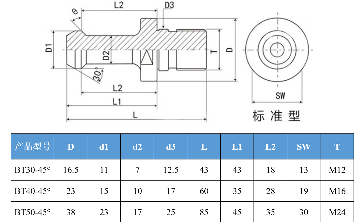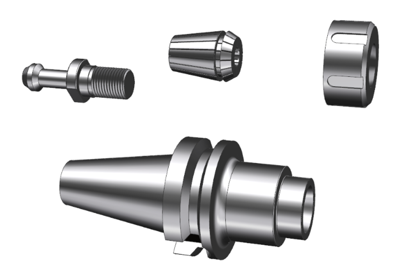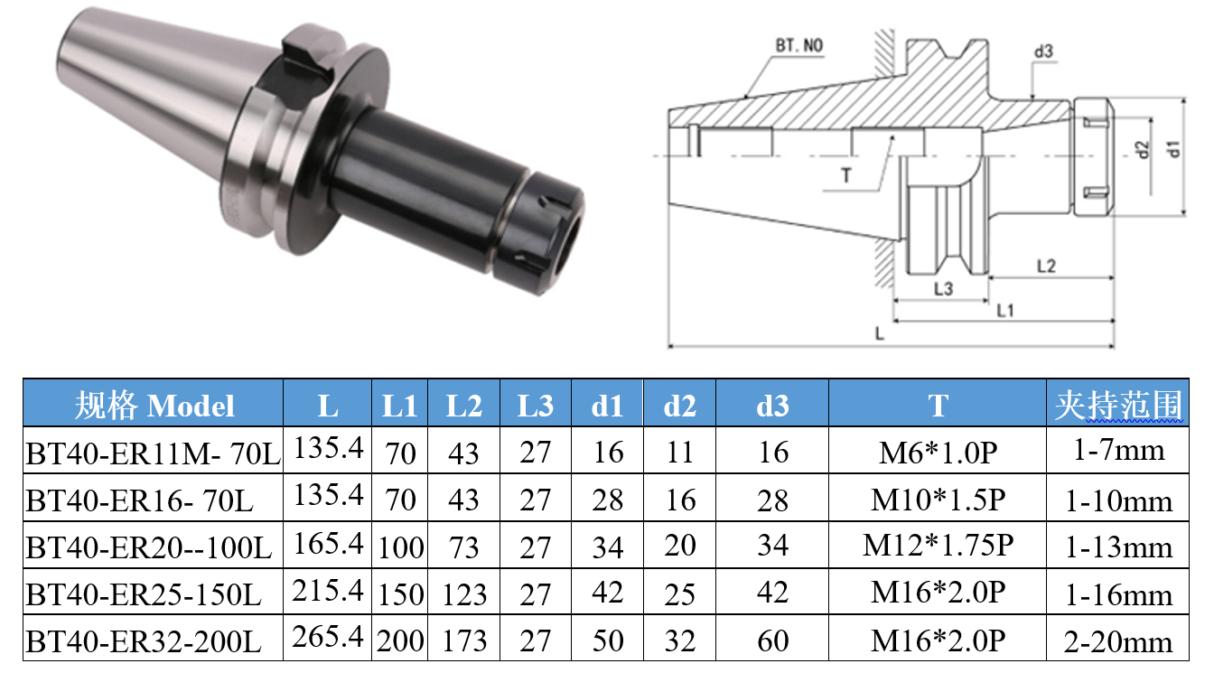 为满足市场潜在用户的需求,数控刀具厂家需要设计制作标准系列化的刀具系统产品,通过不同尺寸规格的零件组合能满足不同的使用场景需要(如机床类型、加持刀具尺寸、加工对象等不同需求),请结合本次项目任务的经验,参考下面提供的资料(产品样式和规格标准),合理制定计划,分工协作完成某个型号(例如BT40ER32)的数控刀具系统的三维建模、装配与制图工作,并提交设计资料(包括三维模型、渲染效果图、零件图及装配图、相关设计说明等)。